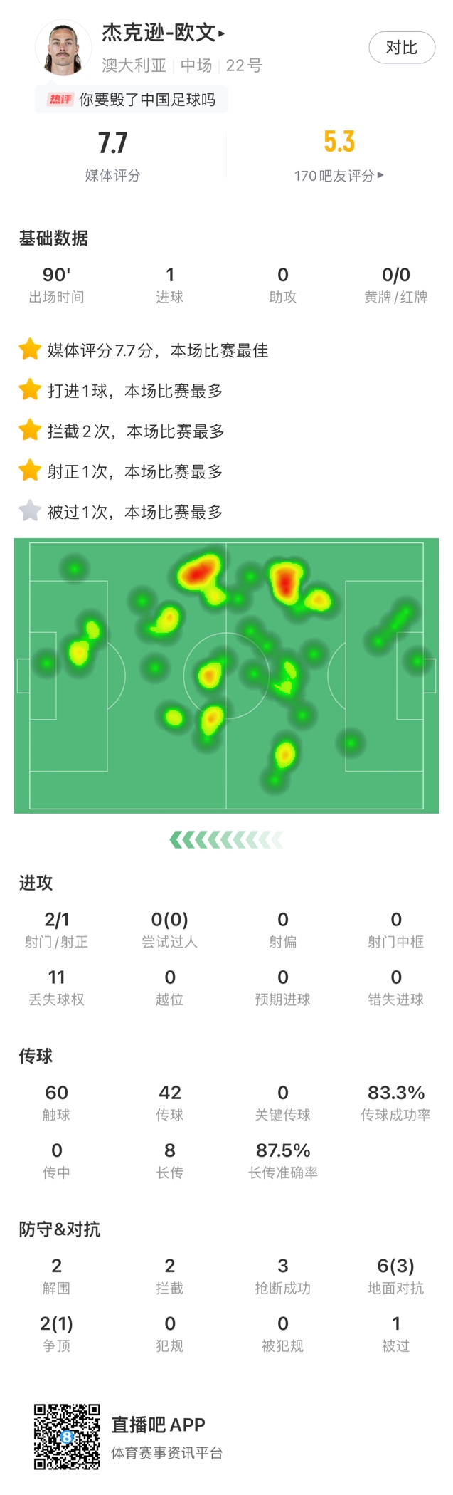 發(fā)布時(shí)間:2025年03月25日 21:50點(diǎn)擊:欄目:足球新聞 03月25日訊 世預(yù)賽亞洲區(qū)18強(qiáng)賽C組第8輪,國足主場(chǎng)0-2輸給澳大利亞,賽后杰克遜-歐文當(dāng)選全場(chǎng)最佳!歐文為澳大利亞打入了第一粒進(jìn)球:杰克遜-歐文本場(chǎng)數(shù)據(jù)↓ 除特別注明外,本站所有內(nèi)容均為九球直播整理排版,轉(zhuǎn)載請(qǐng)注明出處:打入第一球!杰克遜-歐文當(dāng)選國足0-2澳大利亞全場(chǎng)最佳 本文標(biāo)簽: 足球 國家隊(duì) 中國男足 中國足球 澳大利亞