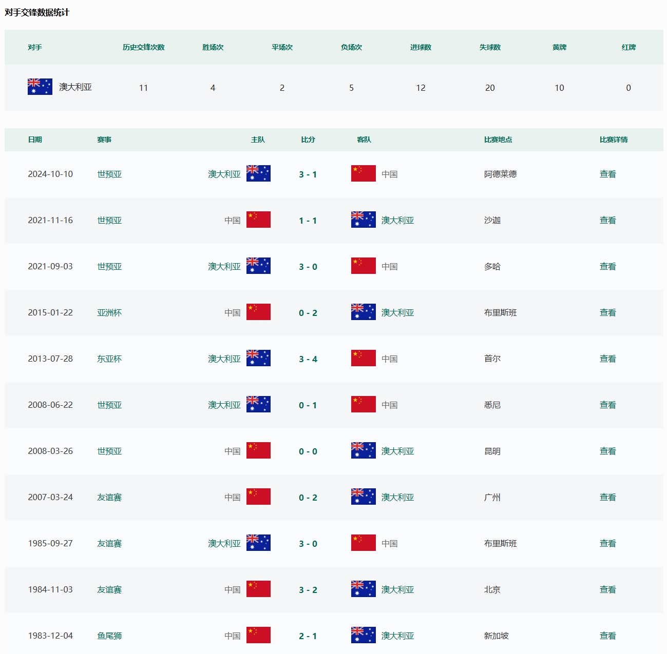 根據(jù)中國足協(xié)官網(wǎng)數(shù)據(jù)顯示,國足共12次交手澳大利亞,取得4勝2平6負的戰(zhàn)績。