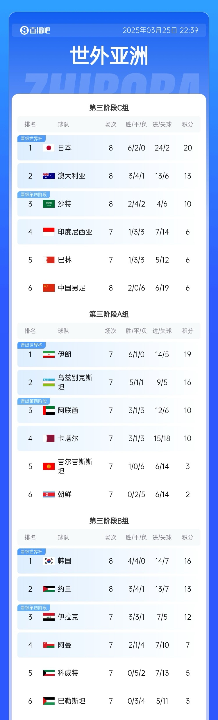 發(fā)布時(shí)間:2025年03月25日 22:50點(diǎn)擊:欄目:足球新聞 除特別注明外,本站所有內(nèi)容均為九球直播整理排版,轉(zhuǎn)載請(qǐng)注明出處:凈勝球負(fù)兩位數(shù)國足8輪丟19球,18強(qiáng)里丟球最多&凈勝球最低 本文標(biāo)簽: 足球 中超 中國足球 國家隊(duì) 中國男足