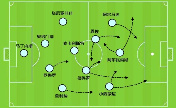 通過(guò)他的大范圍跑動(dòng),不只是回撤還要拉邊,帶來(lái)頻繁的換位。恩佐在前腰位置同樣有著大量的跑動(dòng),給阿爾馬達(dá)內(nèi)切或者是小西蒙尼前插帶來(lái)機(jī)會(huì)。