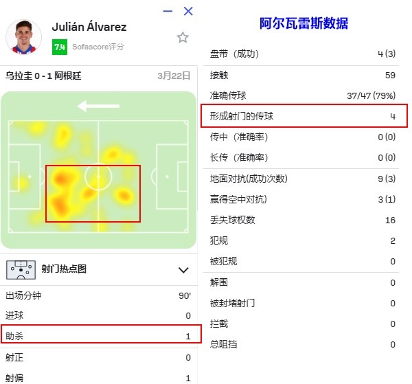 從統(tǒng)計(jì)數(shù)據(jù)可以看到,阿爾瓦雷斯全場(chǎng)只射門1次,卻送出4次關(guān)鍵傳球,最終帶來(lái)一記決定勝負(fù)的助攻。