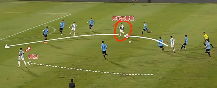 從上一場(chǎng)客場(chǎng)與烏拉圭的世預(yù)賽可以看到,阿爾瓦雷斯被當(dāng)做一個(gè)老年版、不過(guò)人的梅西來(lái)使用。