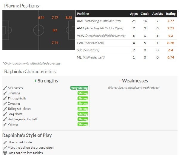 拉菲尼亞本賽季在巴薩的表現(xiàn)非常出色,甚至被視為金球獎(jiǎng)最熱門的候選人之一。問(wèn)題是,他在巴薩踢得好,是因?yàn)楸划?dāng)做攻城拔寨的前鋒來(lái)使用。