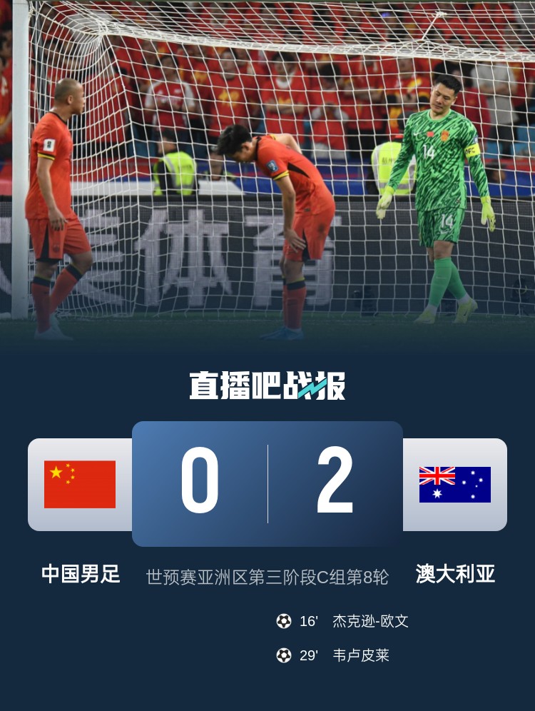 3月25日訊 18強(qiáng)賽C組第8輪,國(guó)足主場(chǎng)0-2不敵澳大利亞,遭遇3連敗,8輪積6分繼續(xù)墊底,無(wú)緣直通美加墨世界杯。
