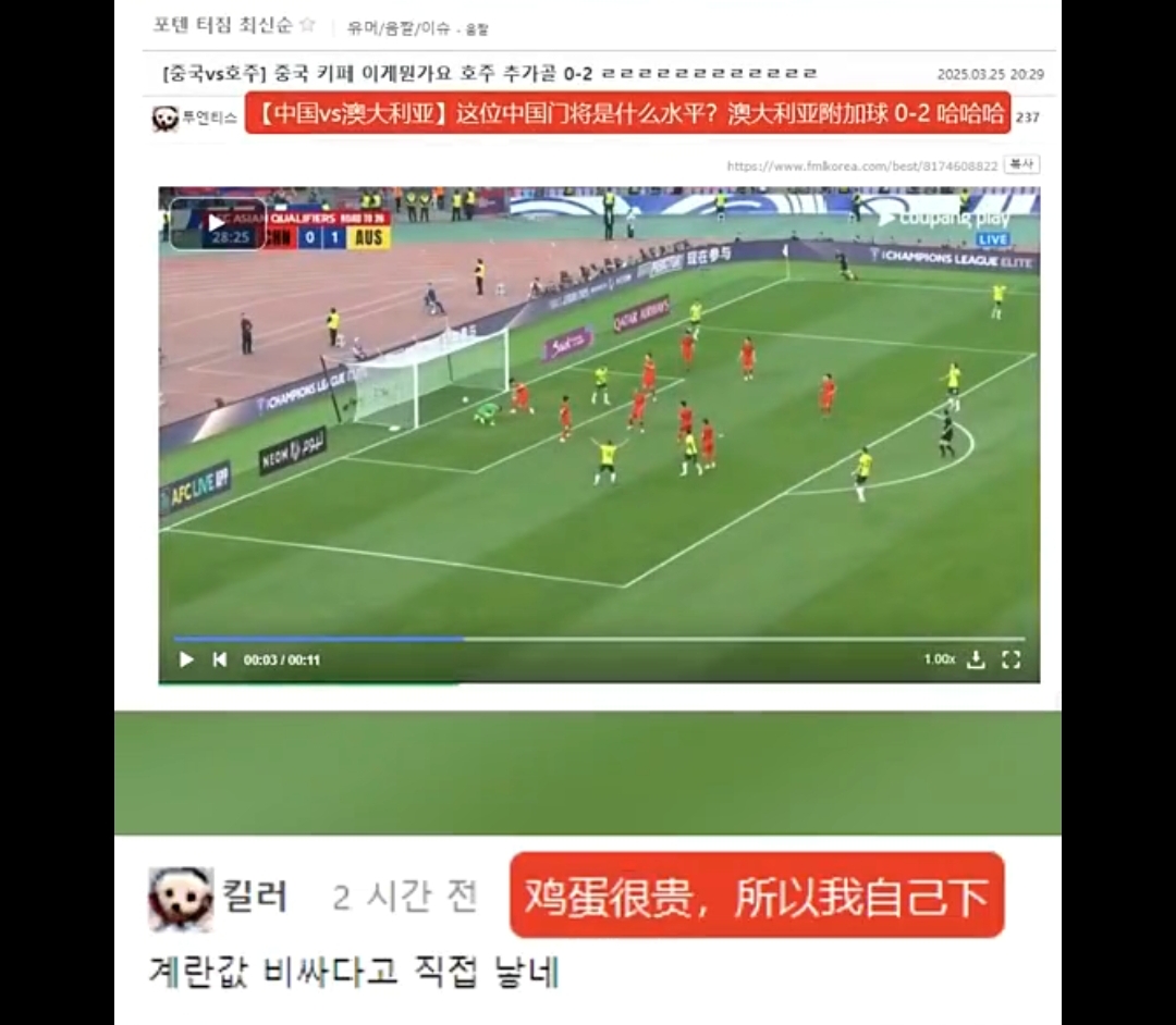03月25日訊 世預(yù)賽亞洲區(qū)18強(qiáng)賽,國(guó)足主場(chǎng)0-2負(fù)于澳大利亞,比賽中王大雷在撲救澳大利亞射門(mén)時(shí)出現(xiàn)失誤丟球,韓國(guó)論壇的網(wǎng)民對(duì)他進(jìn)行了嘲諷。