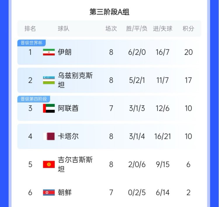 發(fā)布時間:2025年03月26日 02:50點擊:欄目:足球新聞 03月26日訊 世預賽亞洲區(qū)第三階段A組第8輪,塔雷米梅開二度,伊朗2-2戰(zhàn)平烏茲比克斯坦,提前晉級2026年世界杯。伊朗也成為第三支通過預選賽晉級2026世界杯的球隊。目前已有6隊獲得2026世界杯參賽名額,分別是東道主3隊(美國、加拿大、墨西哥)以及日本、新西蘭和伊朗。18強賽A組積分榜: 除特別注明外,本站所有內容均為九球直播整理排版,轉載請注明出處:恭喜!伊朗提前2兩輪晉級2026世界杯,預選賽晉級第三隊 本文標簽: 足球 法甲 德甲 意甲 西甲 英超 伊朗