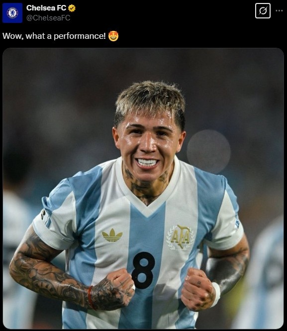 恩佐本場比賽貢獻一傳一射,賽后被TyC體育評為全隊最高分,切爾西官推則曬出球員照片,并寫道:“哇哦!多么出色的表現(xiàn)!”