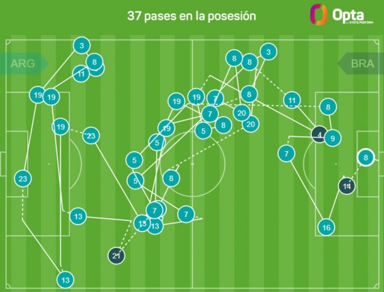 恩佐-費爾南德斯攻入阿根廷本場比賽的第二粒進球,據(jù)Opta統(tǒng)計,這粒進球經(jīng)過37腳連續(xù)傳球,這是本屆南美世預賽連續(xù)傳球次數(shù)第二多的進球。