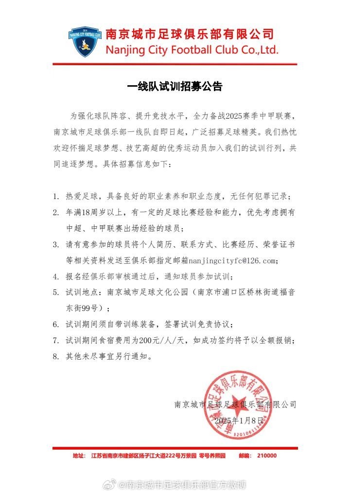 發(fā)布時間:2025年01月09日 13:50點(diǎn)擊:欄目:足球新聞 除特別注明外,本站所有內(nèi)容均為九球直播整理排版,轉(zhuǎn)載請注明出處:公告|南京城市足球俱樂部一線隊試訓(xùn)公告 ??? 本文標(biāo)簽: 中超 中國足球 中甲 足球 轉(zhuǎn)載 南京城市