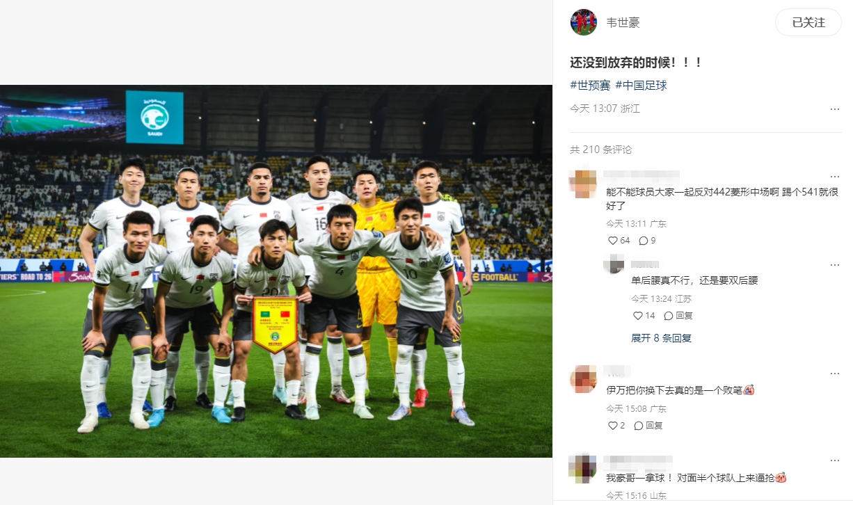 發(fā)布時間:2025年03月27日 15:50點擊:欄目:足球新聞 03月27日訊 世預賽第8輪比賽,中國隊主場0-2不敵澳大利亞。國足遭遇三連敗。今日韋世豪更新個人社媒寫道:還沒到放棄的時候!?。?/p>18強賽目前還剩2輪比賽,6月5日中國隊將會客場挑戰(zhàn)印尼;6月10日中國隊主場迎戰(zhàn)巴林。 除特別注明外,本站所有內(nèi)容均為九球直播整理排版,轉(zhuǎn)載請注明出處:國足遭遇三連敗,韋世豪:還沒到放棄的時候?。?! 本文標簽: 足球 中國男足 中國足球 中超