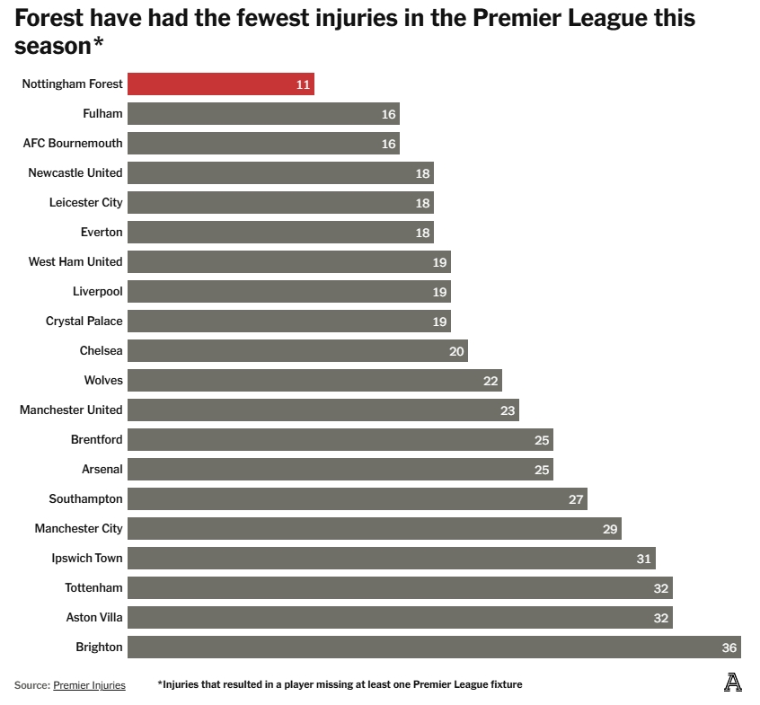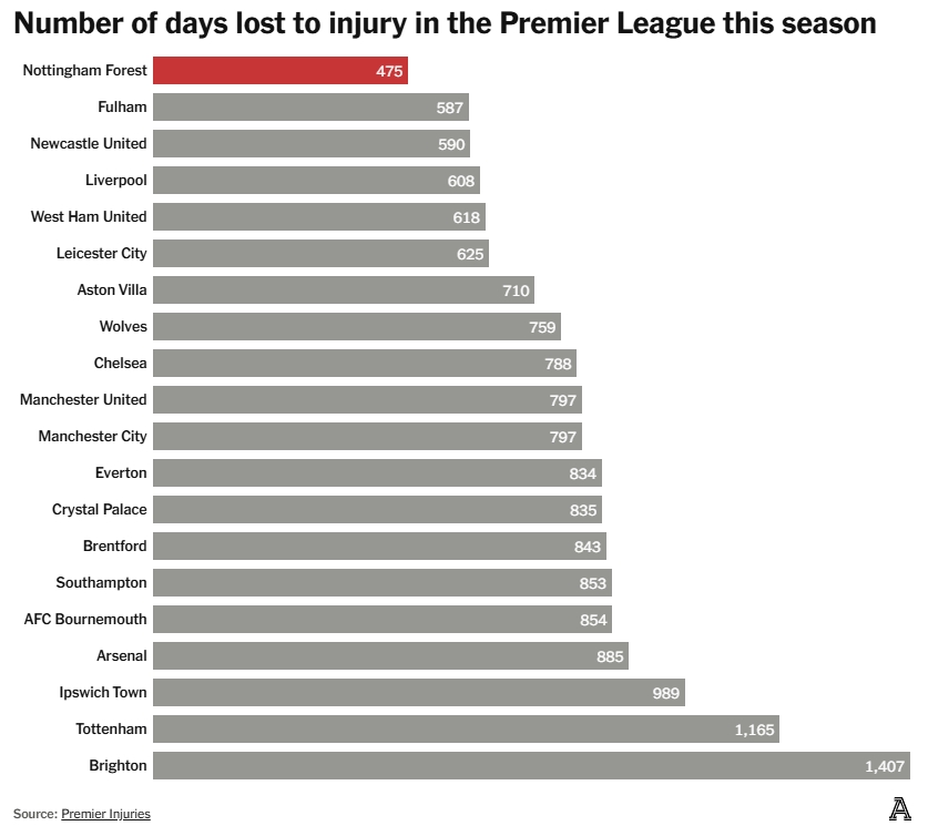 03月27日訊 《The Athletic》撰文分析了英超20支球隊(duì)的傷病情況,諾丁漢森林是本賽季英超傷病最少的球隊(duì),而布萊頓則是傷病最多的。