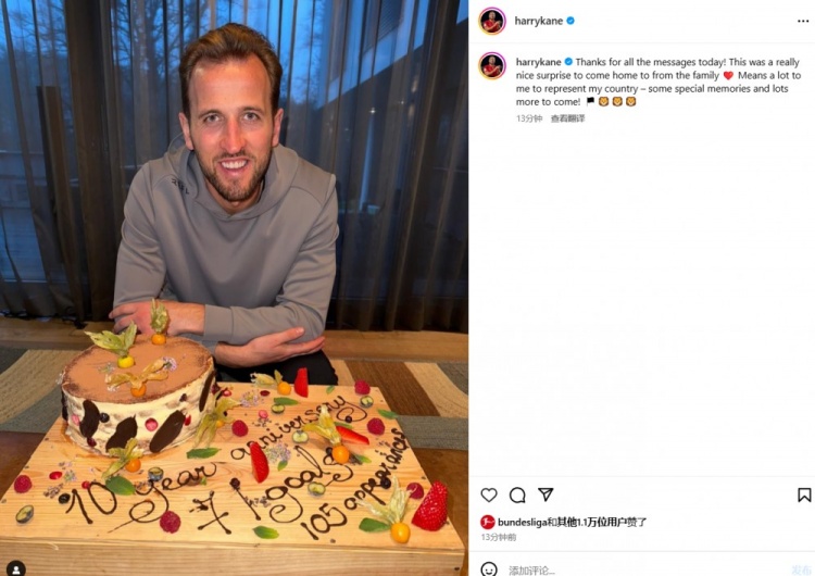 3月27日訊 今天是凱恩代表英格蘭隊(duì)首秀的10周年,凱恩在家中收獲了蛋糕。