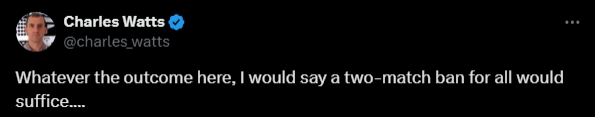 對(duì)此阿森納跟隊(duì)記者Charles Watts發(fā)文調(diào)侃:無(wú)論調(diào)查結(jié)果如何,我認(rèn)為兩場(chǎng)禁賽處罰就夠了……
