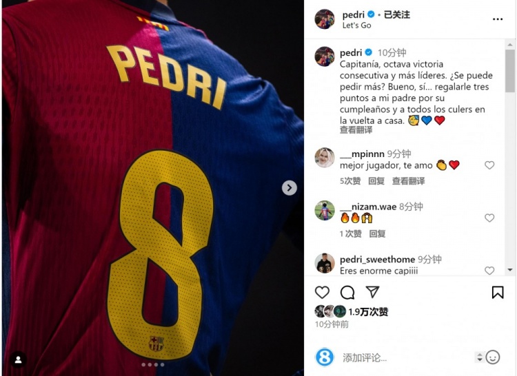 佩德里當(dāng)選本場(chǎng)比賽最佳球員,賽后他在社交媒體上曬出8號(hào)球衣的照片,配文:“擔(dān)任隊(duì)長(zhǎng),西甲8連勝,擴(kuò)大領(lǐng)先優(yōu)勢(shì)。還能要求更多嗎?當(dāng)然可以……為我父親的生日獻(xiàn)上三分,也獻(xiàn)給所有回歸主場(chǎng)的巴薩球迷。”
