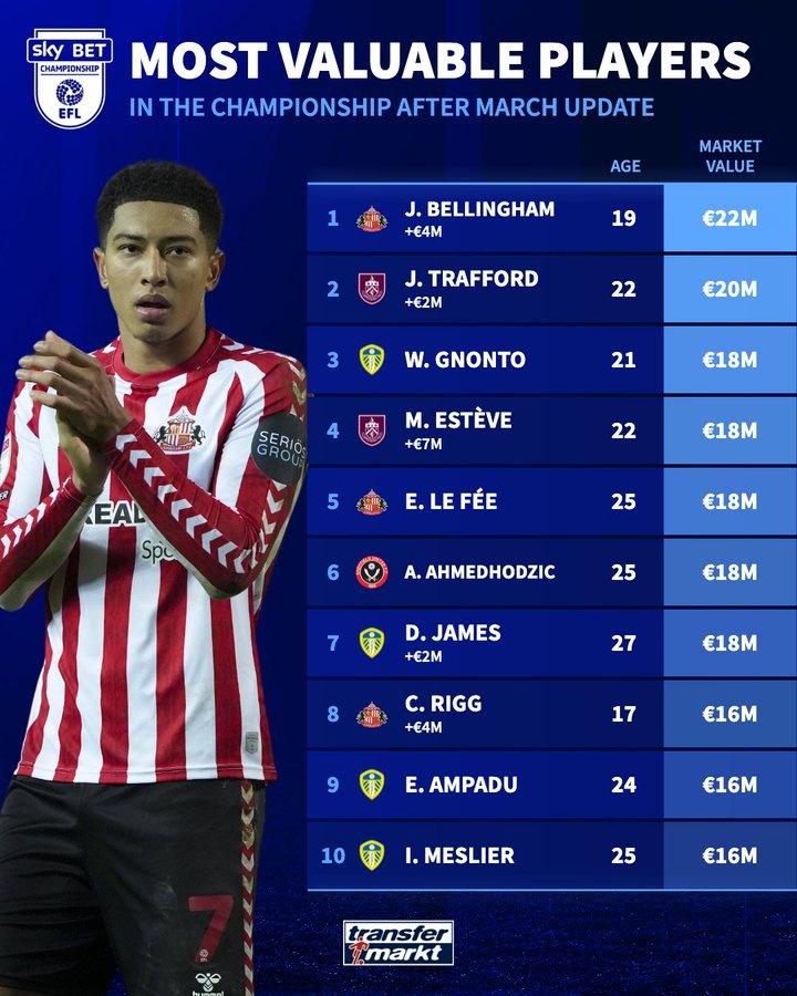 3月28日訊 德國轉會市場今日曬海報,列出英冠球員身價排名,小貝林厄姆2200萬歐元居首。