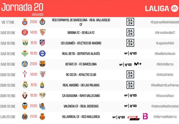 1月9日訊 西甲官方更新社媒動態(tài),宣布第20輪5場比賽開球時間變更,包括赫羅納vs塞維利亞、貝蒂斯vs阿拉維斯、塞爾塔vs畢爾巴鄂、奧薩蘇納vs巴列卡諾、瓦倫西亞vs皇家社會。