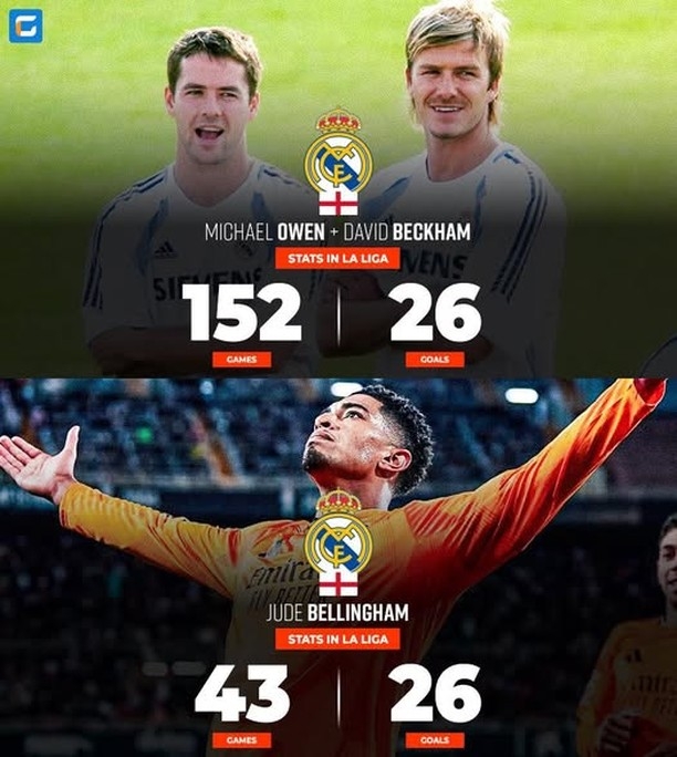 加盟皇馬后,貝林厄姆在代表皇馬出戰(zhàn)的43場(chǎng)西甲比賽中打進(jìn)了26球,追平了貝克漢姆和歐文的進(jìn)球數(shù),兩人共代表皇馬出戰(zhàn)152場(chǎng)西甲比賽。