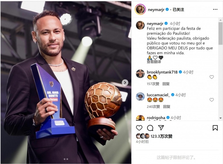 內(nèi)馬爾在對陣國際里梅拉的比賽中的角球直接破門當(dāng)選圣保羅州聯(lián)賽最佳進(jìn)球,他在社交媒體上曬出領(lǐng)獎(jiǎng)?wù)掌?,配文:“很高興參加圣保羅州聯(lián)賽頒獎(jiǎng)典禮,感謝圣保羅州足協(xié),感謝投票支持我的進(jìn)球的球迷,感謝上帝在我生命中所做的一切!”