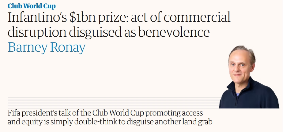 對(duì)此衛(wèi)報(bào)記者Barney Ronay撰文對(duì)世俱杯進(jìn)行抨擊,認(rèn)為這一賽事龐大的獎(jiǎng)金總數(shù)看似很美好,但對(duì)足球生態(tài)存在負(fù)面影響,更是將其稱(chēng)為“披著善意外衣的商業(yè)顛覆行為”。