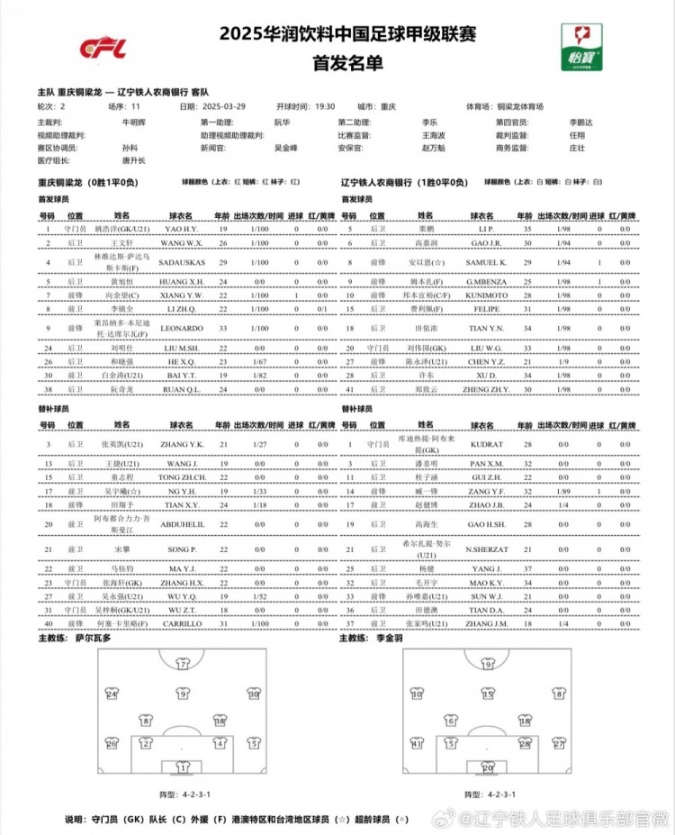 3月29日訊 今晚19:30,中甲第2輪迎來一場(chǎng)焦點(diǎn)戰(zhàn),重慶銅梁龍主場(chǎng)對(duì)陣遼寧鐵人,賽前雙方首發(fā)陣容公布。