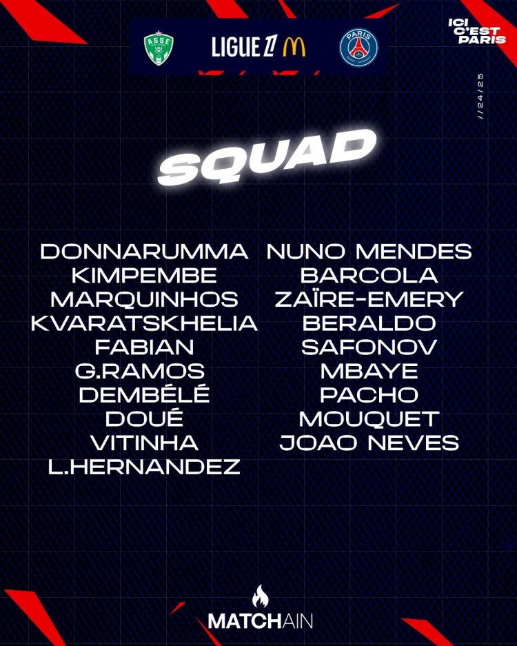 巴黎對陣圣埃蒂安名單: