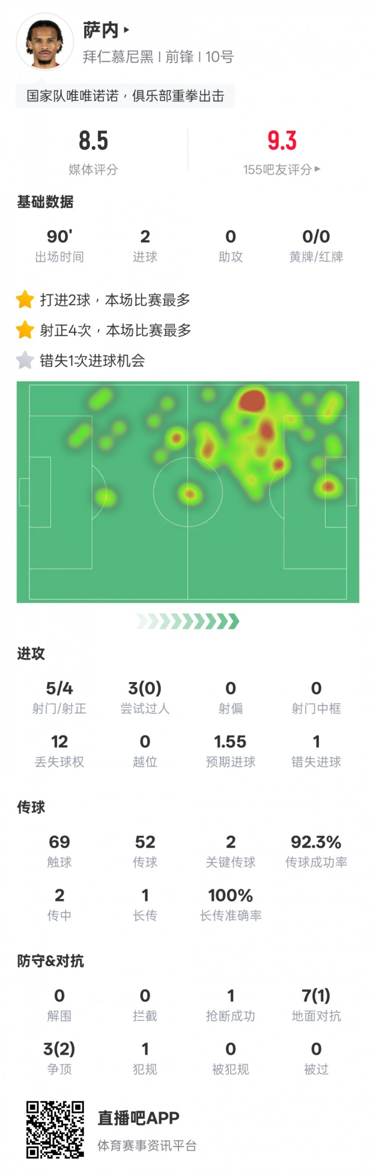 3月30日訊 德甲第27輪,拜仁3-2圣保利,薩內(nèi)首發(fā)出戰(zhàn),打進(jìn)2球,送出2次關(guān)鍵傳球,錯(cuò)失1次進(jìn)球機(jī)會(huì),評(píng)分8.5。