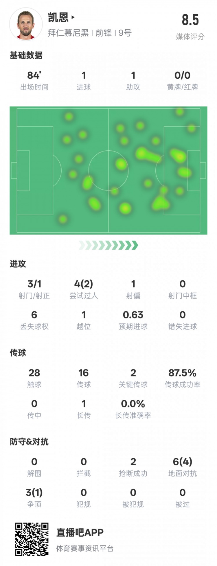 凱恩本場(chǎng)比賽數(shù)據(jù)如下: