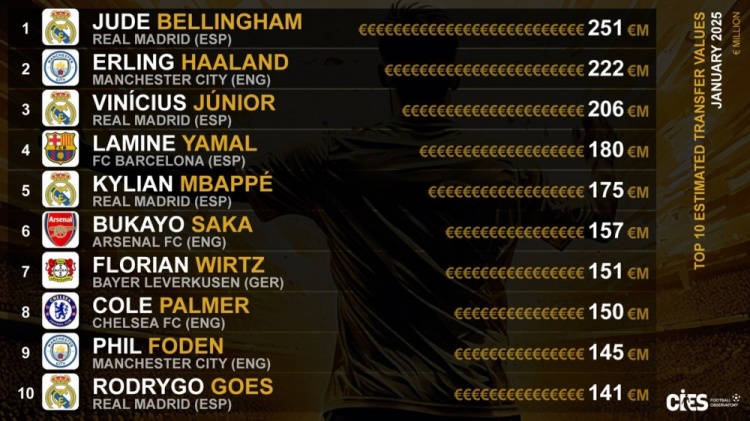 1月9日訊 CIES(瑞士足球天文臺(tái))計(jì)算了球員的轉(zhuǎn)會(huì)價(jià)值,并列出榜單,貝林厄姆2.51億歐居首,哈蘭德、維尼修斯排名二三位。