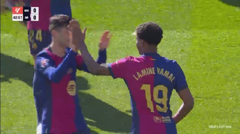 03月30日訊 西甲第29輪,巴塞羅那vs赫羅納。比賽第44分鐘,亞馬爾任意球打在了克雷吉奇的身上彈進球門,巴薩1-0領先!