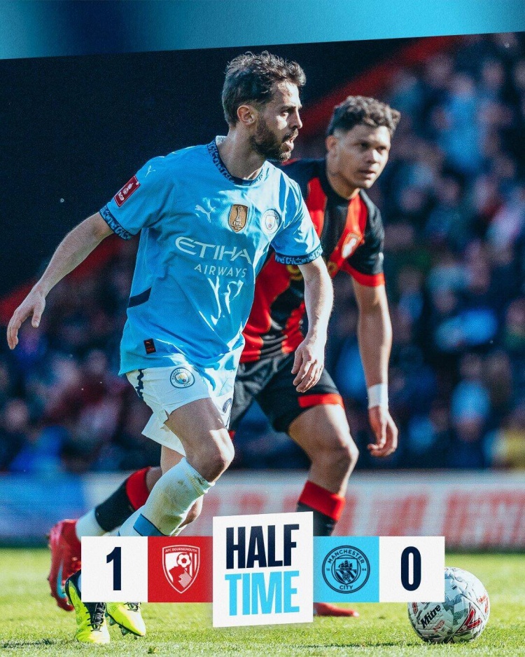 上半場傷停補時1分鐘,半場結(jié)束,伯恩茅斯暫1-0曼城。