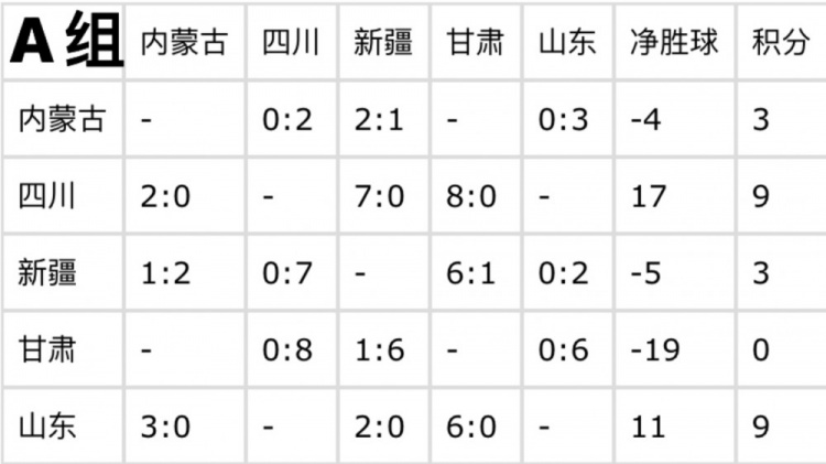 目前,四川和山東同積9分,憑借出色的表現(xiàn)已提前鎖定出線資格。在凈勝球方面,四川以17個凈勝球領先,山東凈勝球為11個。內蒙古和新疆均積3分,甘肅積0分已確定無緣出線。最后一輪比賽,雖無直接影響出線的關鍵對決,但各隊仍會為榮譽而戰(zhàn),力求以更好的成績結束資格賽階段。
