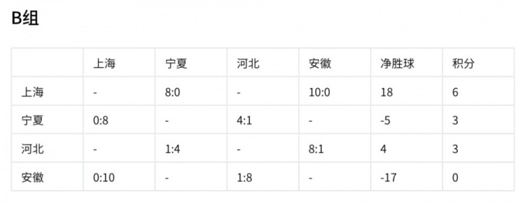 上海隊以6分、18個凈勝球的優(yōu)勢提前出線。寧夏和河北同積3分,寧夏凈勝球為 -5,河北凈勝球為4,安徽積0分已出局。最后一輪比賽,各隊的表現(xiàn)將決定最終排名,寧夏和河北都渴望在最后一戰(zhàn)中爭取更好名次。