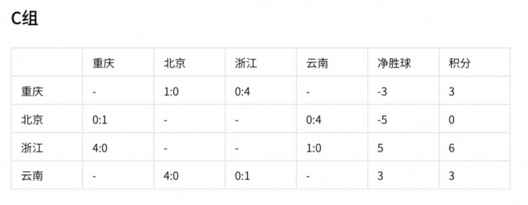 浙江已確定一個出線資格,重慶vs云南,誰勝將獲得小組第二,若打平雙方各積 4分,云南獲得小組第二,重慶積4分獲得小組第三凈勝球為-3個,以成績最好的小組第三出線概率較低。
