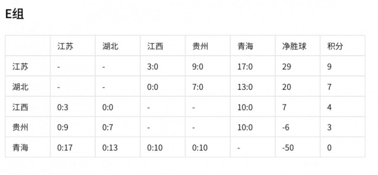 江蘇隊以9分和29個凈勝球的絕對優(yōu)勢提前出線。湖北積7分、凈勝球20個,出線形勢大好;江西積4分、凈勝球7個,仍有出線機會;貴州積3分、凈勝球 -6,青海積0分、凈勝球 -50已出局。最后一輪比賽,各隊之間的競爭將決定剩余出線名額的歸屬,比賽結果充滿懸念。
