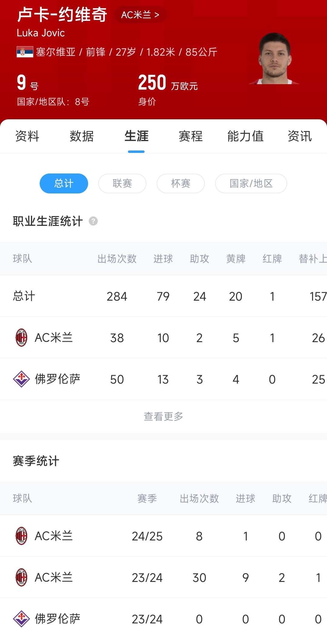 上賽季約維奇代表AC米蘭出戰(zhàn)30場(chǎng)比賽,貢獻(xiàn)9粒進(jìn)球和2次助攻,是球隊(duì)的重要輪換球員。但本賽季受傷病困擾,約維奇僅出戰(zhàn)8場(chǎng)比賽,打進(jìn)1球。