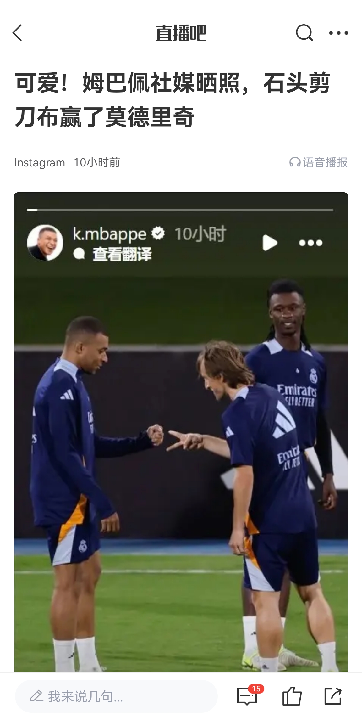 01月09日訊 姆巴佩此前社媒曬照,自己猜拳贏了莫德里奇,并配文“你必須要去里面了”,莫德里奇轉(zhuǎn)發(fā)了這條動(dòng)態(tài),并配了笑哭的表情符號(hào)。
