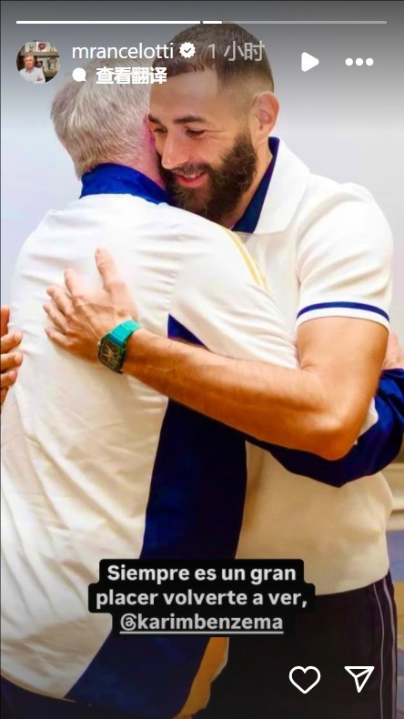 在個(gè)人社媒,安切洛蒂曬出他與本澤馬擁抱的照片,并且配文:“很高興再次見(jiàn)到你”。現(xiàn)年37歲的本澤馬在皇馬效力14年,與安切洛蒂一起贏得過(guò)多項(xiàng)榮譽(yù)。