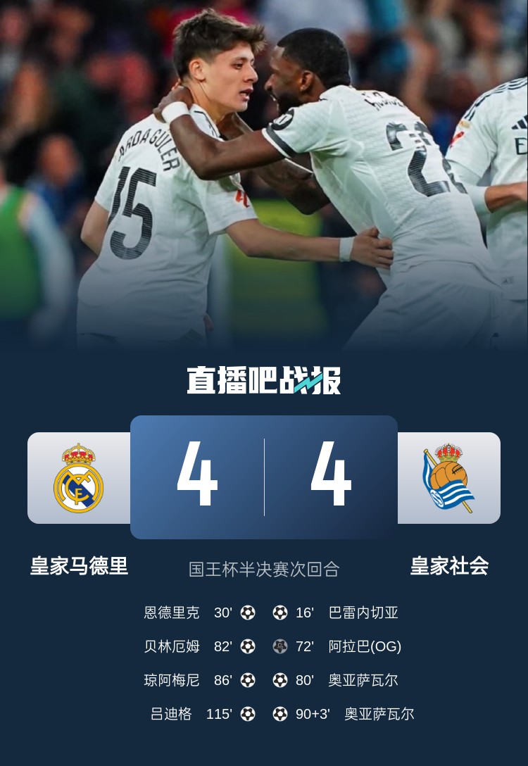 晉級(jí)決賽!皇馬4-4總分5-4皇社 呂迪格加時(shí)絕殺恩德里克貝林建功