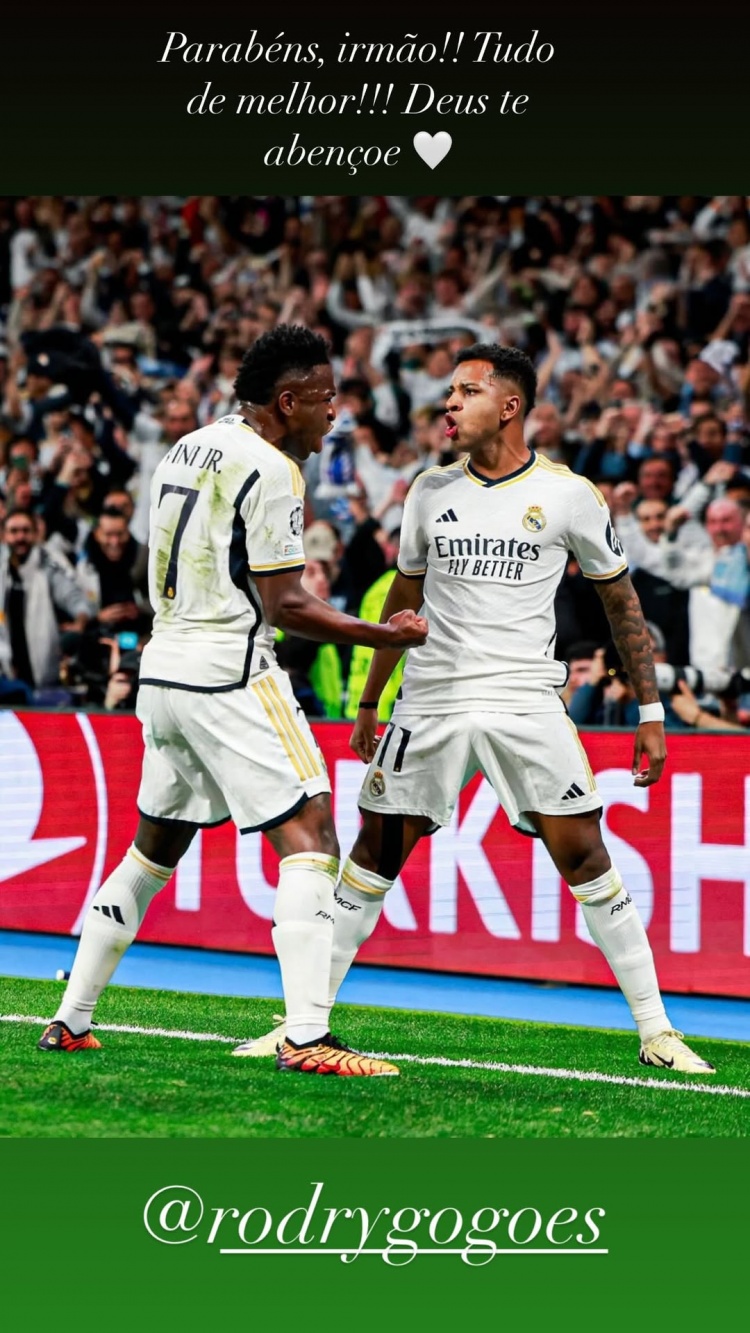 維尼修斯在社交媒體上曬出與羅德里戈的賽場上慶祝的合照,配文:“生日快樂,兄弟!一切順利,上帝保佑你?!?/p>