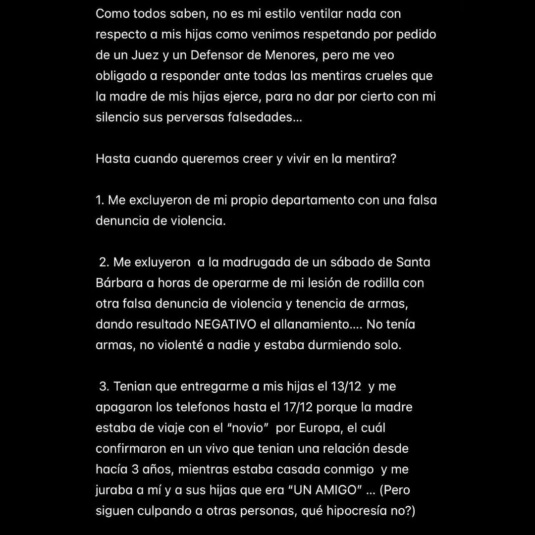 眾所周知,我一向不公開我女兒們的任何事情,正如法官和兒童監(jiān)察員要求的那樣。但我有義務(wù)對我女兒們的母親所說的所有殘酷謊言做出回應(yīng),以免我的沉默使她倒行逆施的謊言成為理所當然......我們還要在謊言中相信和生活多久?