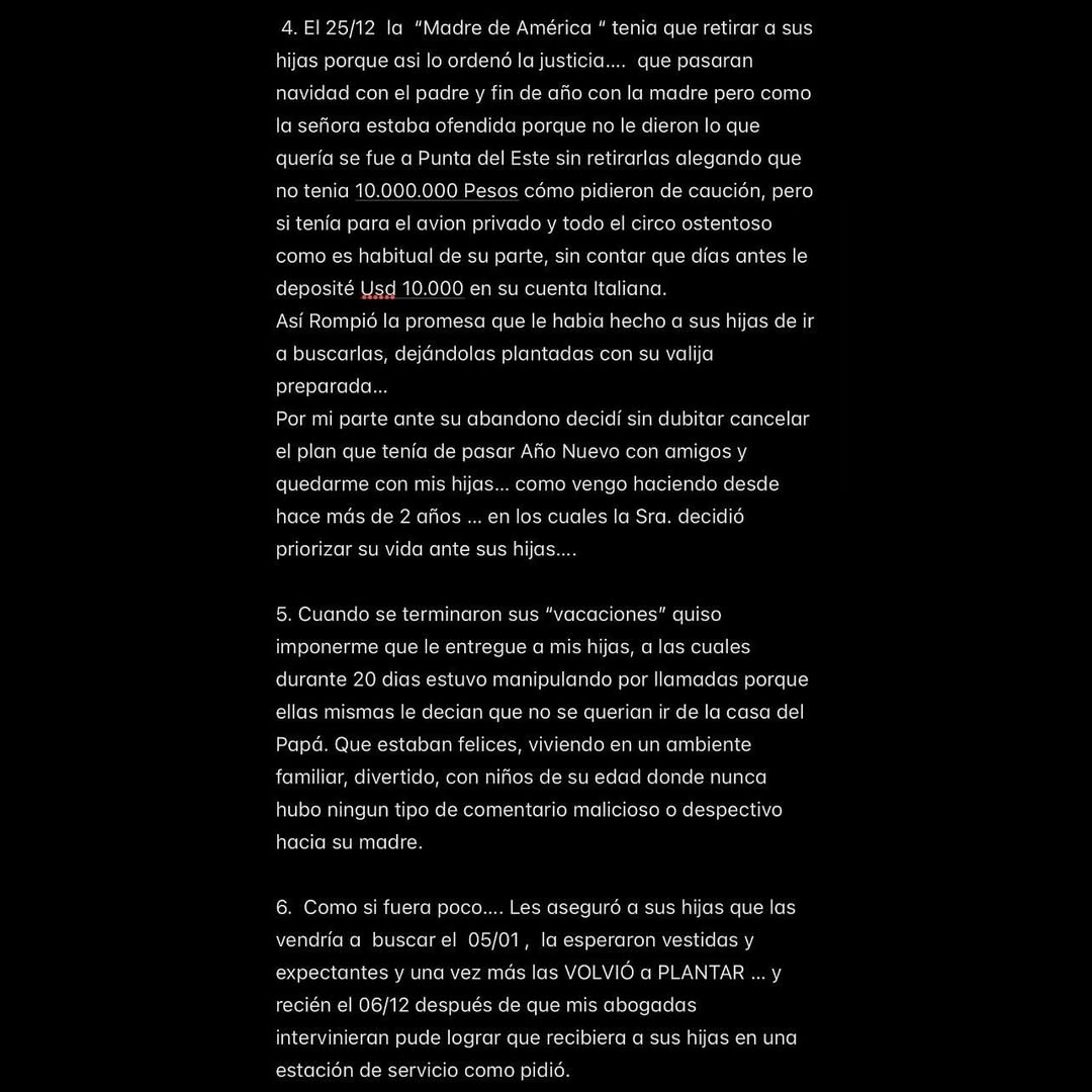4、12月25日,這位“美國之母 ”不得不接走她的女兒們,因為法院的命令....她們應(yīng)該與父親共度圣誕節(jié),與孩子的母親共度新年夜。但這位女士因為法院沒有滿足她的要求而感到不快,她沒有接孩子就自己去了埃斯特角城,還聲稱她并沒有法院要求的1000萬比索(約合人民幣7萬元)的保證金,但她卻有足夠的錢乘坐私人飛機和參加所有炫耀性的馬戲表演,她一直都是如此。更何況幾天前我還在她的意大利賬戶上存了10000 美元。她違背了對女兒們許下的諾言,沒有去接她們。而我,面對她對女兒們的拋棄,我毫不猶豫地決定取消與朋友共度跨年夜的計劃,與女兒們待在一起,就像我兩年多來一直做的那樣。在此期間,她卻決定將自己的生活置于女兒們之上。