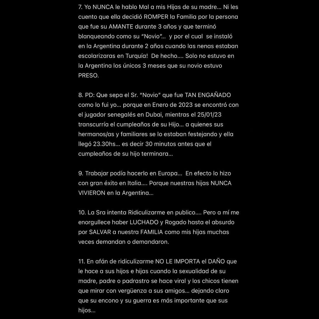 7、我從來沒有對我的女兒們說她們母親的壞話……我甚至沒有告訴她們,她為了一個和她交往三年的情人而拆散家庭。而這個人最后還被她說成是她的 “男朋友”......當女兒們在土耳其上學(xué)時,她卻為了這個人搬到阿根廷住了兩年!事實上,她只是在她男友入獄的三個月里不在阿根廷。