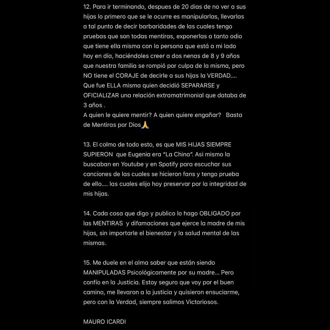 13、最重要的是,我的女兒們一直都知道尤金妮亞(伊卡爾迪新歡,全名María Eugenia Suárez Riveiro,又稱China Suárez或La China)是誰,她們會在Youtube和Spotify上查找她的資料,聽她的歌,并成為她的歌迷。為了我女兒們的安全,我今天選擇保留這些證據(jù)。