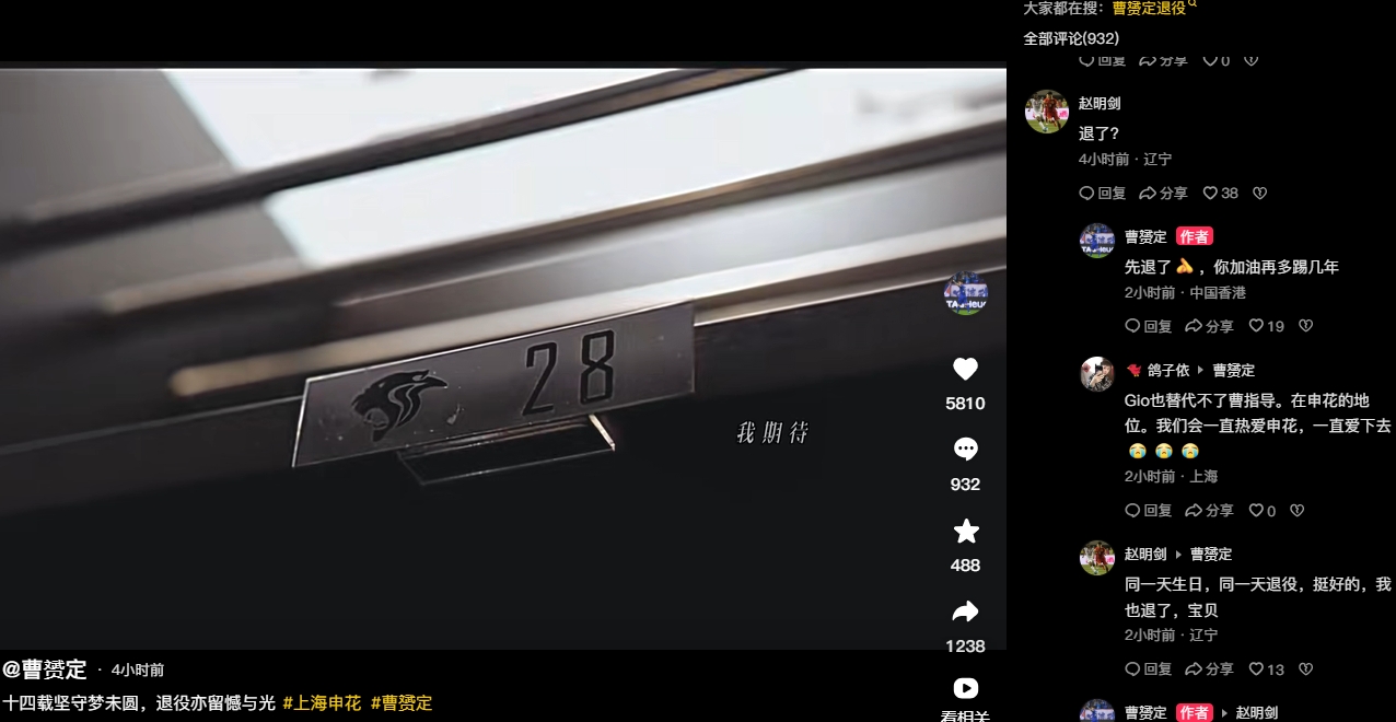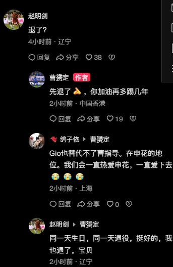 12月31日訊 趙明劍在曹赟定社媒上回復(fù)曹赟定,疑似宣布自己也將退役。
