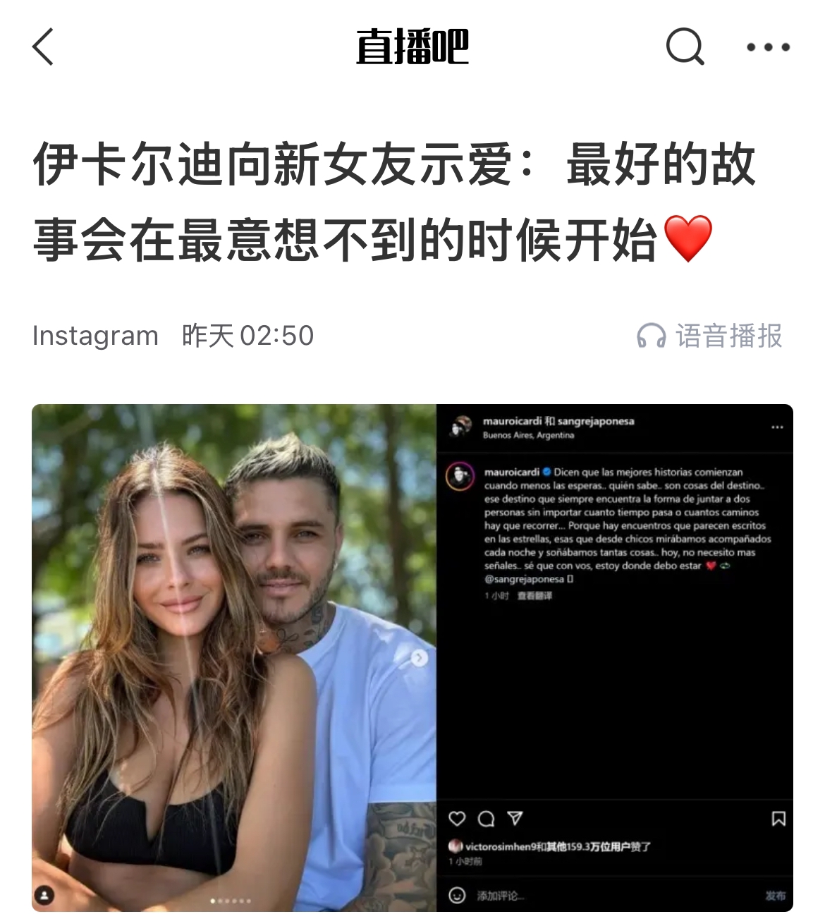 發(fā)布時(shí)間:2025年01月11日 07:28點(diǎn)擊:欄目:足球新聞 除特別注明外,本站所有內(nèi)容均為九球直播整理排版,轉(zhuǎn)載請注明出處:背后都有故事?伊卡爾迪新女友正是4年前的出軌對象 本文標(biāo)簽: 足球 法甲 意甲