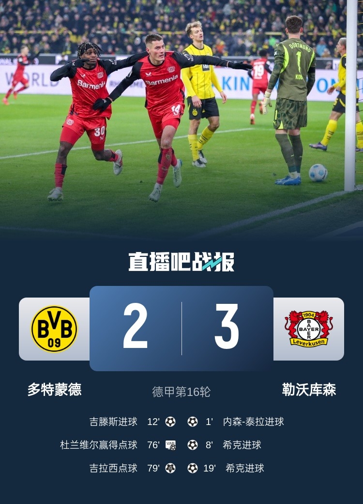 希克雙響,多特2-3勒沃庫森。積分榜方面,勒沃庫森先賽距榜首拜仁1分。