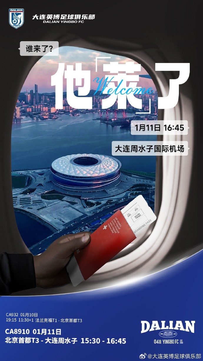 01月11日訊 大連英博昨日官方發(fā)布“他萊了”,預(yù)熱馬萊萊將在11日下午抵達(dá)大連,航班由法蘭克福到北京,再由北京飛往大連。