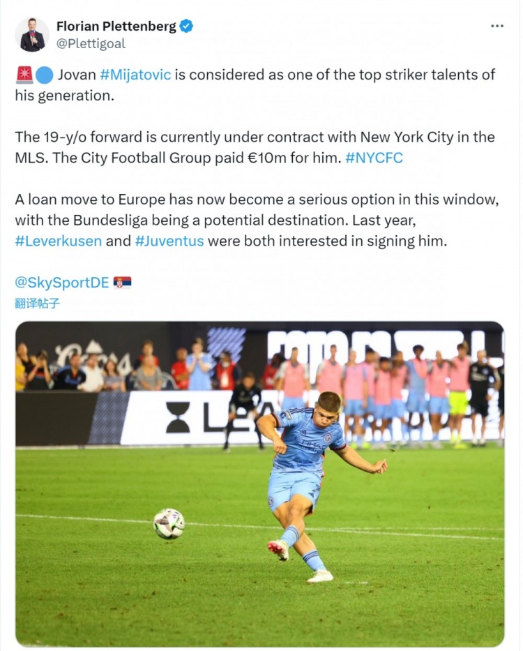 普萊滕伯格指出,米賈托維奇被視為同年齡段最優(yōu)秀的中鋒之一,城市足球集團(tuán)去年以1000萬(wàn)歐元從貝爾格萊德紅星簽下他,目前這位塞爾維亞小將效力于美職聯(lián)俱樂(lè)部紐約城。