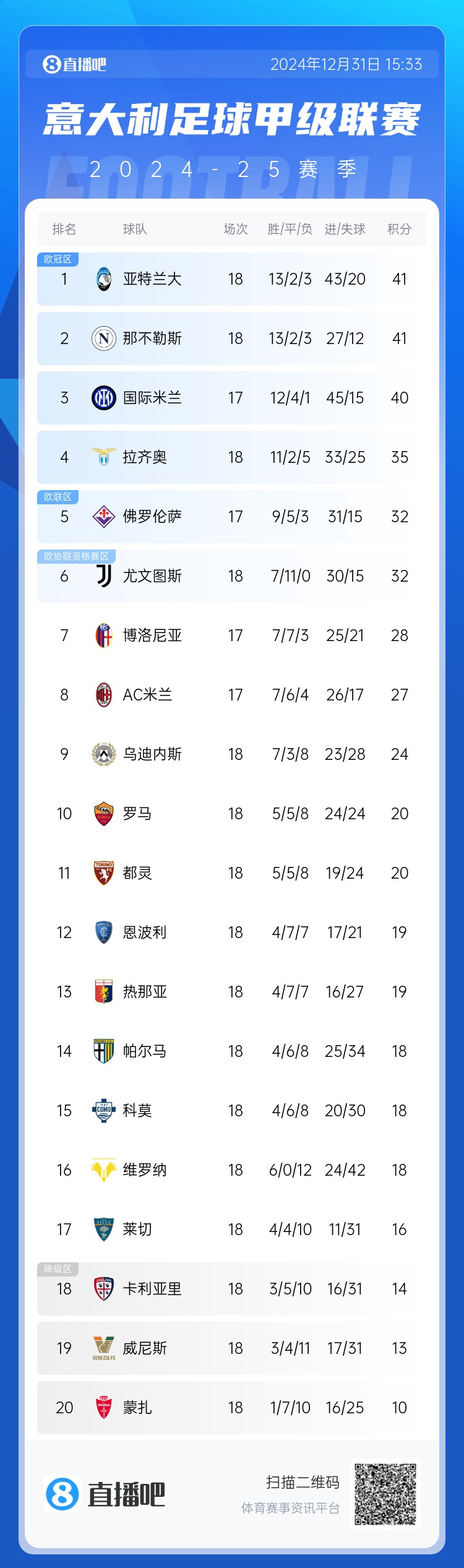 意甲積分榜: