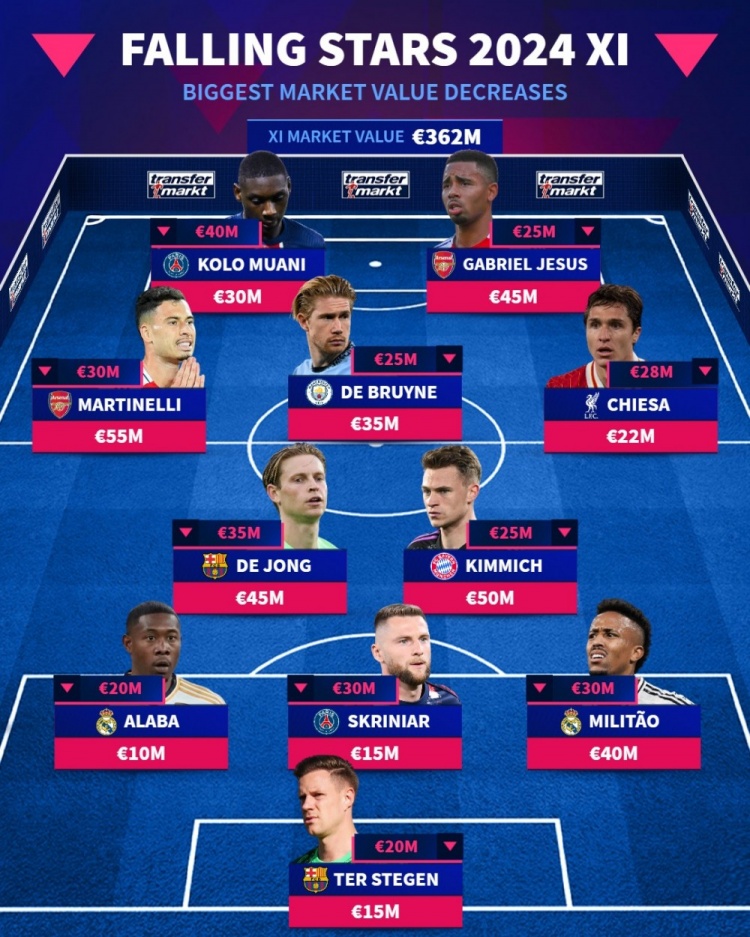1月1日訊 德轉(zhuǎn)列出了2024年身價(jià)下滑陣容,德布勞內(nèi)、德容、基米希、熱蘇斯、穆阿尼在列。